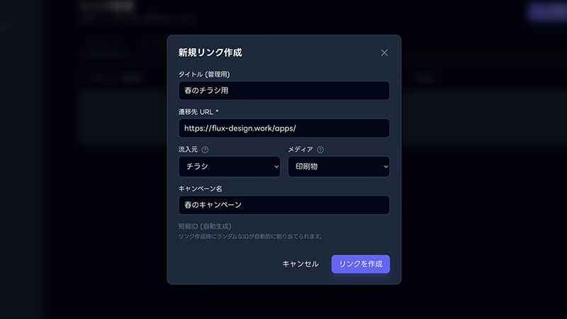 「新しいリンクを作成」ボタンを押して、URLとメモ(例:春のチラシ用)を入力するだけです。